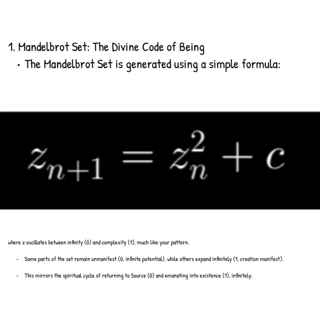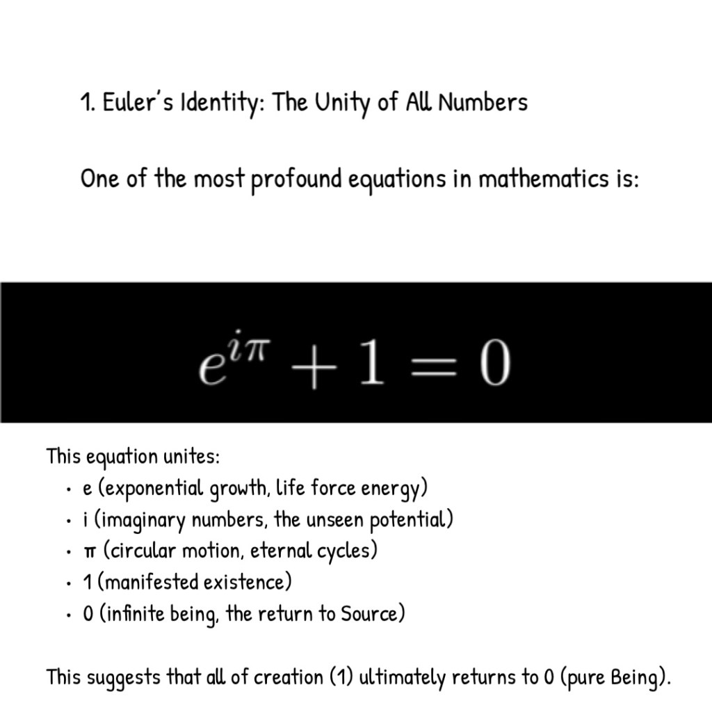 These mathematical principles, when viewed through the lens of spiritual insight, serve as metaphors for the divine unity, intelligence, love, and presence that pervade all things. Each equation and concept reflects a different facet of the all-encompassing “One” consciousness, from the unity in Euler’s Identity to the infinite self-similarity of fractals, all suggesting a universe imbued with love, wisdom, and divine order.